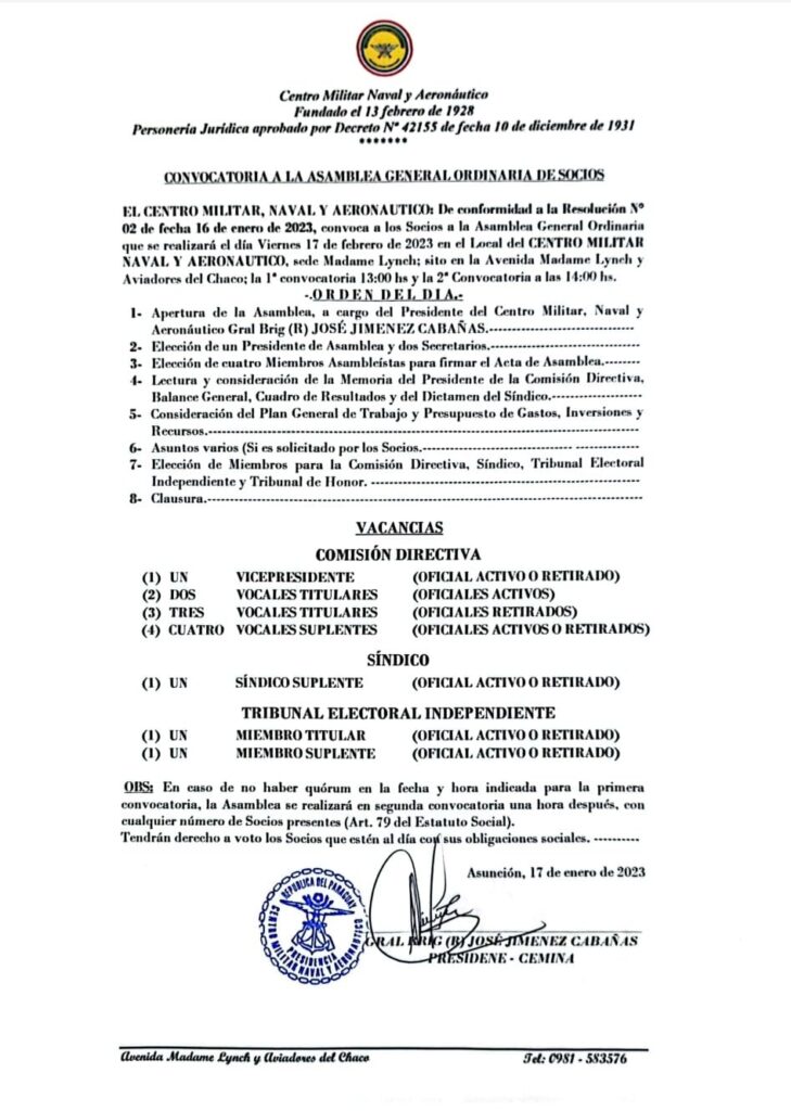 Convocatoria a Asamblea General Ordinaria de Socios y Calendario Electoral 2023 del Centro Militar