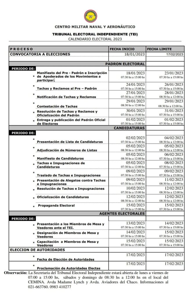 Para conocimiento de los distinguidos socios/as del Centro Militar Naval y Aeronáutico, se pone de manifiesto el Pre-Padrón de Electores. En tal sentido el mismo se encuentra a disposición de los interesados en la Oficina del Tribunal Electoral Independiente del Centro Militar (Sede "Mdme. Lynch" Av .Aviadores del Chaco esq. Madame Lynch, Asunción)